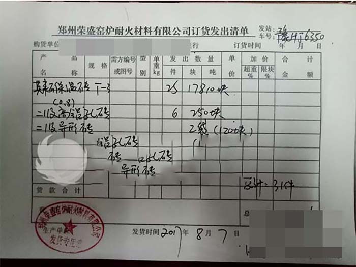 這次發(fā)貨的對象是江西的客戶,江西的客戶要了17810塊t-3莫來石保溫磚、250塊二級高鋁孔磚、120塊二級異型磚。江西客戶也是榮盛的老客戶了,這次的訂單江西客戶對榮盛表現(xiàn)出了十分的信任,并沒有派人再到鄭州進行考察,是直接給榮盛銷售達到電話訂的單,并且在電話里表達出了想和榮盛保持長期合作的態(tài)度,出于對合作伙伴的支持,榮盛也給了江西客戶優(yōu)惠的價格。