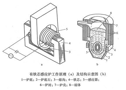 有芯爐分為上下爐體,上爐體有爐蓋、爐膛;下爐體為感應體,有熔溝等,爐子本身相當于一個帶鐵芯的變壓器,感應線圈相當于變壓器的一次線圈,熔溝中的金屬相當于變壓器的二次線圈。將工業頻率的交流電引進一次線圈時,通過電磁感應,在熔溝金屬中將產生很大的電流。在熱對流及電磁力的作用下,熔溝內熱量不斷傳遞到熔溝上部熔爐中的金屬,從而使整個熔池內的金屬熔化。因只有在熔溝閉合狀態下有芯感應爐才能正常運行,所以適于連續作業。